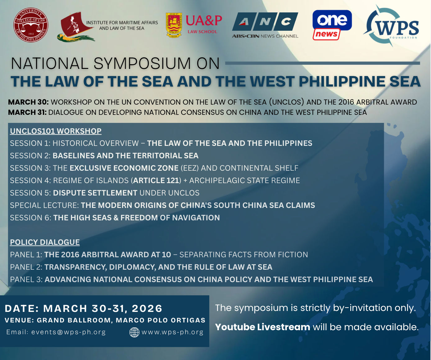 Manila, Philippines — March 18, 2026 — The WPS Foundation, in partnership with the University of the Philippines Institute for Maritime Affairs and Law of the Sea (UP IMLOS) and the University of Asia and the Pacific School of Law, will convene the National Symposium on the Law of the Sea and the West Philippine Sea on March 30–31, 2026 in Manila.